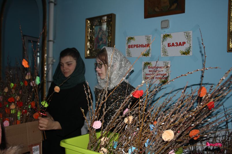 По сложившейся в нашем храме традиции ученики воскресной школы ежегодно проводят «Вербный базар», на котором прихожане могут приобрести освященные и красиво украшенные веточки вербы. Вся воскресная школа с усердием готовилась к этому празднику. Взрослые нарезали веточки, а ребята на уроках труда сделали для них украшения. Перед вечерним богослужением и перед Божественной литургией воспитанники старшей группы провели благотворительную акцию «Вербный базар» под девизом: «Вербочку возьми – многодетной семье помоги».