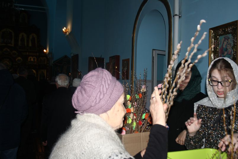 Этот праздник в России называют ещё Вербным воскресеньем, потому что в нашей стране верба распускается одной из первых и символизирует пальмовые ветви, которыми жители Иерусалима приветствовали Спасителя. Накануне, за вечерним богослужением, отец Анатолий освятил вербы.