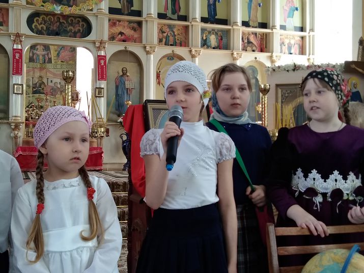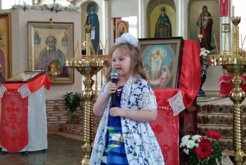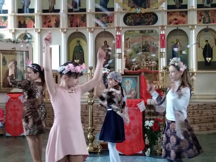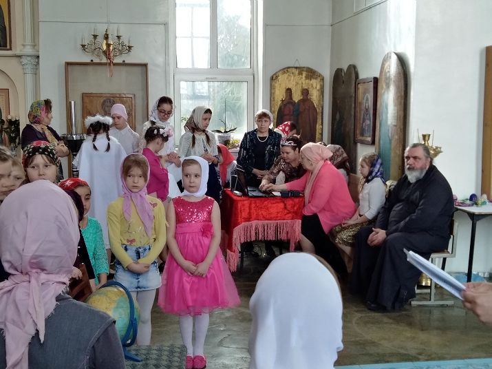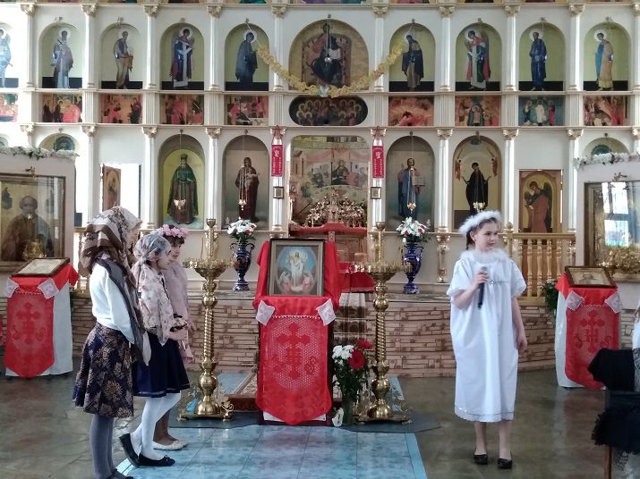 Праздничный утренник начался пасхальными песнопениями учащихся воскресной школы. В коротких театрализованных постановках маленькие актёры рассказали о чудесах, которые творил Господь, о Воскресении Иисуса Христа, о традициях, которые соблюдают христиане в дни подготовки и празднования Пасхи. Юные артисты напомнили, что окрашенные в красный цвет яйца символизируют кровь распятого Христа, и что обычай дарить друг другу расписные яйца сохранился со времен Марии Магдалины.
