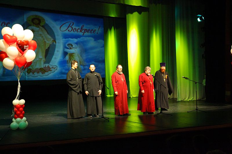 В завершении пасхального концерта слово было предоставлено благочинному Орского округа протоиерею Александру Куцову и настоятелю храма Покрова Пресвятой Богородицы (бывший женский монастырь) протоиерею Анатолию Сопиге. Они поздравили от лица епископа Орского и Гайского Иринея всех присутствующих в зале с праздником Святой Пасхи и выразили благодарность в организации праздничного вечера заместителю главы г. Орска по социальной политике Елене Абузяровой, начальнику отдела культуры г. Орска Ирине Отокиной, директору Орского драматического театра им. А.С. Пушкина Владимиру Дорошенко и заместителю директора драмтеатра по работе со зрителями Натальи Кунициной.