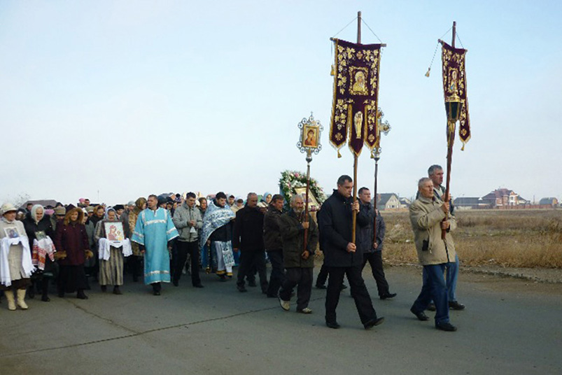 Открываются ближайшие к алтарю железные двери, и на улицу выносят большую храмовую икону Казанской Богородицы. Настоятель иерей Вячеслав Коротков, окруженный певчими, выводит православный люд на Западный проспект, и под акафист празднику около пятисот человек устремляются к часовне на кумакских высотах.