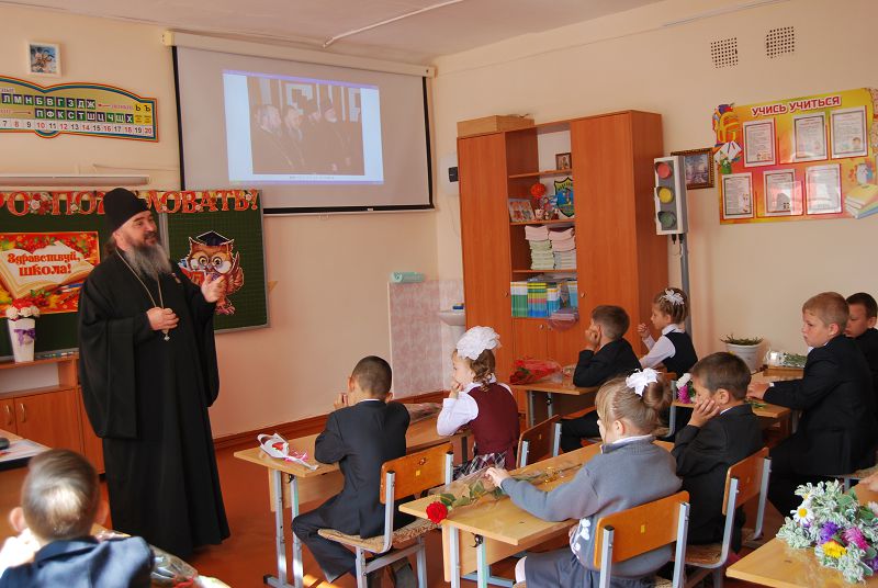 После линейки священник на классном часе встретился с учениками второго класса педагога В.Г. Алпатовой. Как настоятель прихода и почетный гражданин города Кувандыка, отец Симеон рассказал детям о своей жизни, и о храме, о необходимости получения хороших знаний, которые помогут в дальнейшей жизни, поделился мыслями о строительстве воскресной школы. Дети и родители с большим интересом слушали батюшку, задавали вопросы. В классе были ребята, которые уже занимались в воскресной школе, многие из учеников пожелали посетить храм и учиться в воскресной школе.
