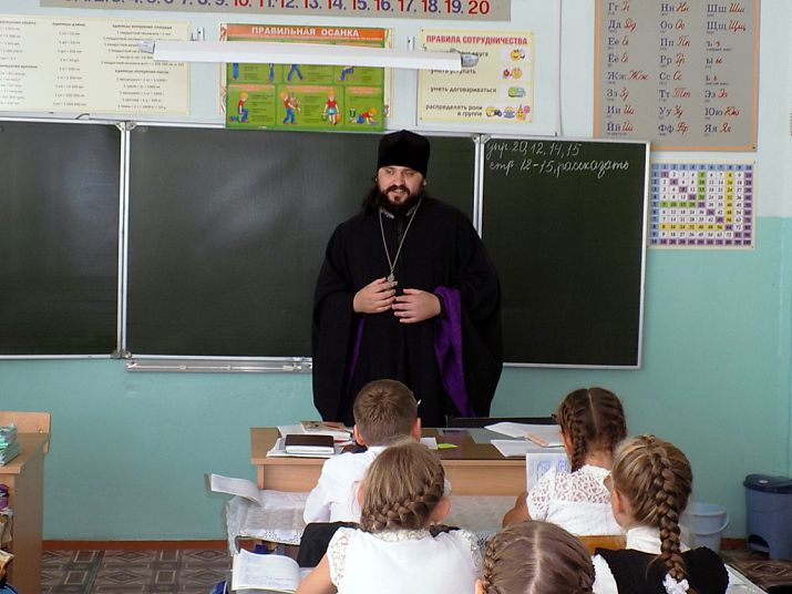 С учащимися одного из четвёртых классов Светлинской общеобразовательной школы № 1 отец Михаил порассуждал о русских народных сказках. Во многих из них кроется глубокий внутренний смысл: в них написано о человеческих страстях, о добродетелях, о предназначении человека, о смысле жизни. Для примера батюшка напомнил о некоторых известных всем с детства героях. В частности, как выяснилось, Колобок – это образ человека, сбежавшего от родительского поучения, от мудрости старшего поколения, который движется по жизни, куда глаза глядят, и не просто идёт, а катится, как тот Колобок. Итог такой жизни – гибель от хитросплетений судьбы (та самая Лиса, которая проглотила Колобка). В Православии такие хитросплетения называются скорби, которые нам надлежит перетерпеть по попущению Божию для нашего духовного вразумления и спасения.