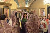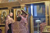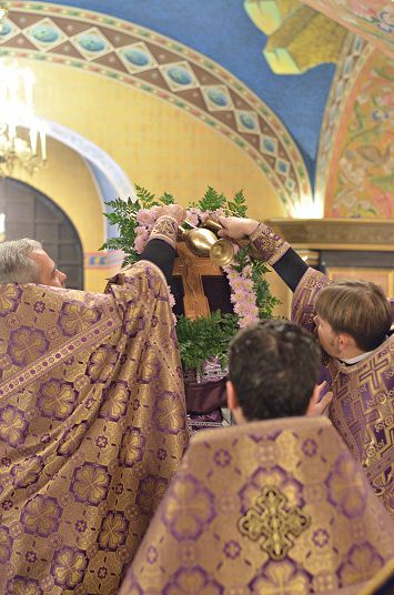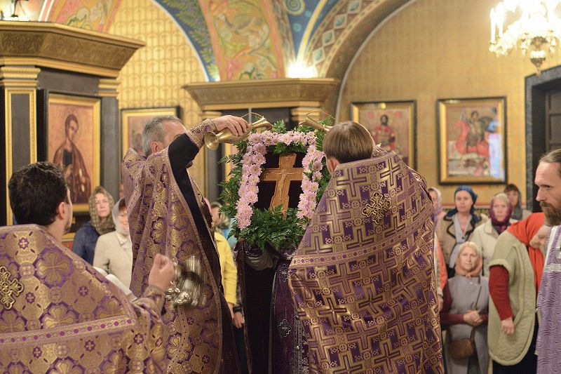 Во время всенощной службы из алтаря был вынесен Крест Господень в обрамлении цветов, после чего протоиерей Александр Куцов совершил пятикратное воздвижение креста, обращаясь лицом на восток, запад, юг, север и снова на восток. При этом, по иерусалимской традиции, священнослужители с двух сторон осторожно понемногу лили на Крест розовую воду из сосудов.