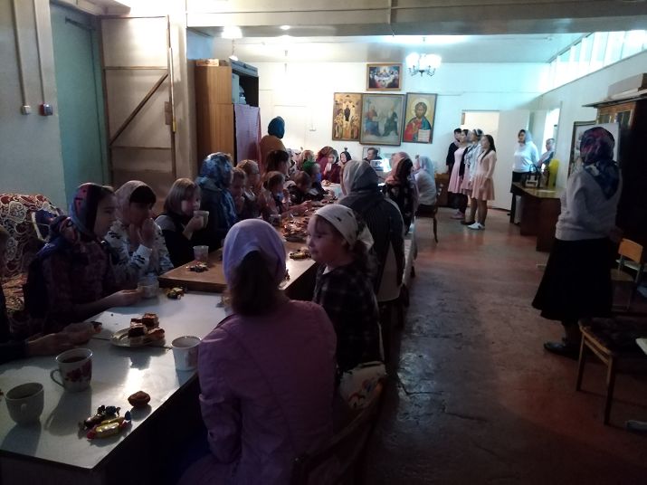 Преподаватели и родители накрыли для приглашенных праздничный стол, воспитанники воскресной школы подготовили небольшой концерт, все вместе смотрели фильмы о наших почивших ветеранах: монахине Татиане (Коровиной), которая была основателем и директором воскресной школы, Надежде Ивановне Насыровой, преподавателе и главном организаторе многих мероприятий, ее маме Александре Марковне Ширинских – она стояла у истоков основания церковной общины. Также вспомнили монахиню Евдокию (Тихонову), регента хора Тамару Валентиновну Оленко, помощницу и жертвователя Светлану Юрьевну Миляеву, пропели «вечную память» им и другим бывшим работникам храма, вспоминая всех поименно; каждый из них потрудился для становления и процветания прихода, во славу Божию, не жалея сил.