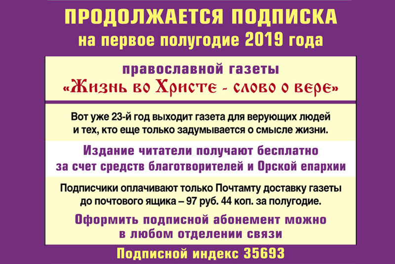 ОРСК. 20 ноября 2018 г. В Оренбургской области продолжается подписка на первое полугодие 2019 года на православную газету «Жизнь во Христе – слово о вере».
