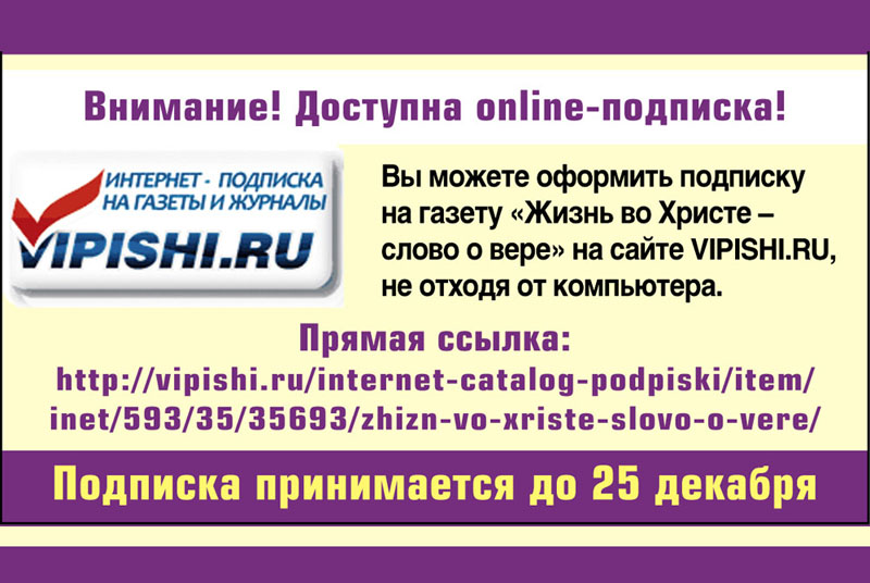 Теперь вы можете оформить подписку на газету «Жизнь во Христе – слово о вере», не отходя от компьютера на сайте http://VIPISHI.RU