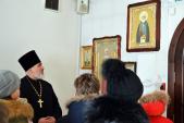 Гостей встретил настоятель храма протоиерей Вячеслав Кочкин. С первых шагов отец Вячеслав обратил внимание ребят на то, что в дом Господень входят благоговейно, осеняя себя крестным знаменем, и научил детей правильно его совершать. Затем батюшка немало рассказал о внутреннем устройстве храма. Юные слушатели узнали о месте и назначении иконостаса, алтаря, клироса.
