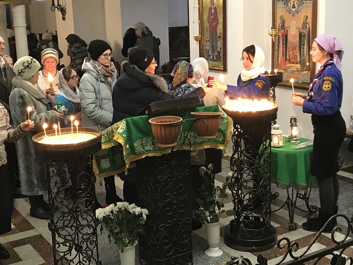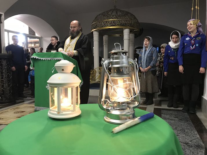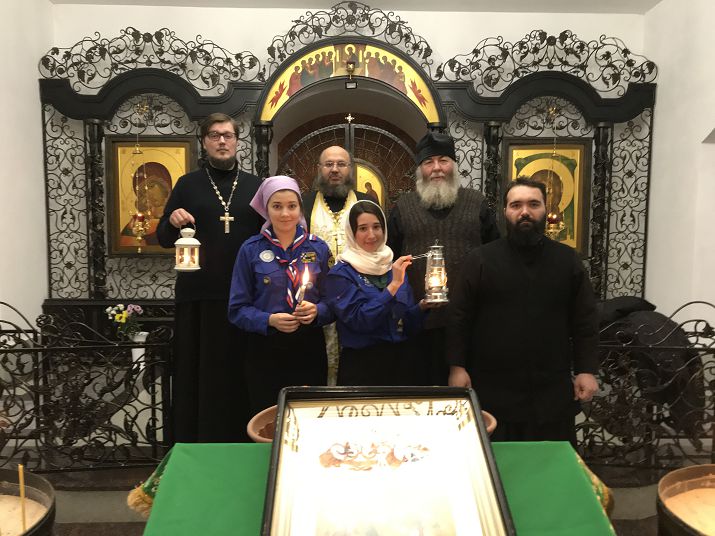 Затем оренбургские скауты отправились в Новотроицк, в собор свв. первоверховных апостолов Петра и Павла, где священники и прихожане встретили их у врат с крестным ходом. Благочинный новотроицкого округа протоиерей Сергий Кваша возглавил благодарственный молебен, прихожане зажгли свои лампады и унесли с собой огонь.