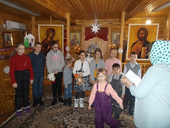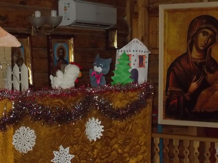 Праздник начался с чтения акафиста Рождеству Христову. После молитвы дети воскресной школы показали прихожанам кукольную сценку «Кот, Петух и Лиса» и подарили прихожанам поделки, сделанные своими руками.