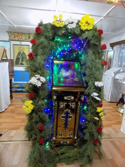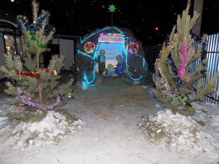 В этом году в соответствии с многолетней традицией храм украшал символический вертеп из веток сосны, а во дворе храма стоял украшенный гирляндами снежный вертеп, крыша которого также была сделана из сосновых веток и сена. За порядком на территории храма следили светлинские казаки.