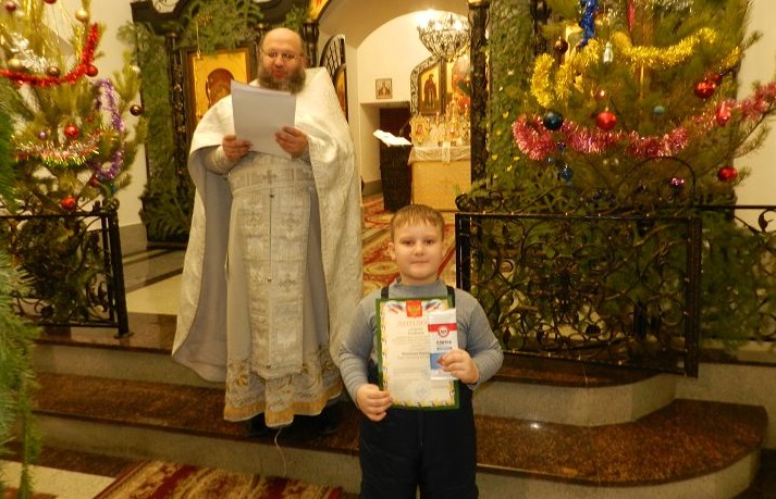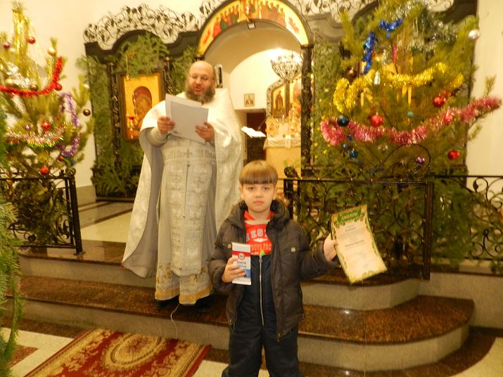 От отдела образования и прихода св. прав. Иоанна Кронштадтского настоятель вручил дипломы и сладкие подарки шестнадцати победителям муниципального конкурса детского рисунка «Русь святая» среди детей школьного и дошкольного возраста, в разных номинациях: «Разнообразие и самобытность русских народных костюмов», «Красота русской природы» и др.