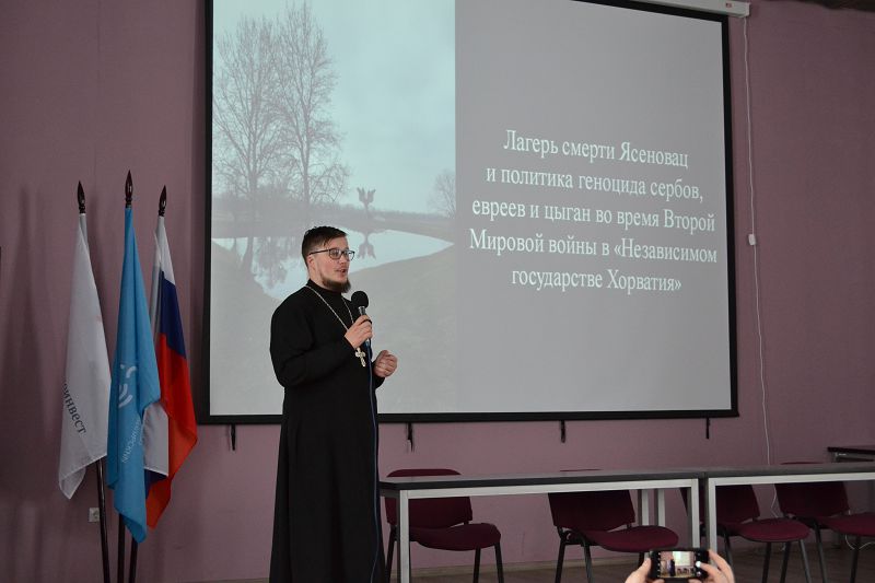 НОВОТРОИЦК. 25 февраля 2019 г. В Новотроицком филиале Московского института стали и сплавов по инициативе и непосредственном участии пресс-секретаря Орской епархии иерея Максима Бражникова состоялась выставка «Живые: новомученики концлагеря Ясеновац в свете Воскресения».