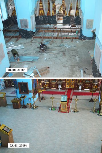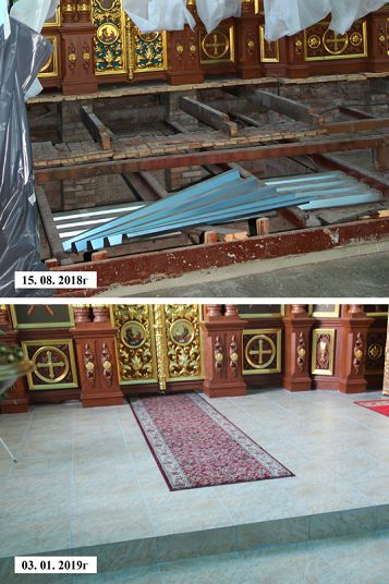 На время строительных работ богослужения совершались в домовом храме приходской воскресной школы. Все работы были окончены к празднованию Рождества Христова. Теперь в храме тепло и уютно. Теплый пол установили по всей площади, включая алтарь и приделы.
