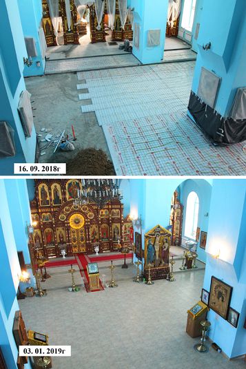 Сразу возникли сложности из-за того, что под полом храма была пустые пространства, и строителям пришлось вначале смонтировать металлическую подвесную опалубку, залить бетонный пол, а затем выполнить работы по устройству теплого пола.