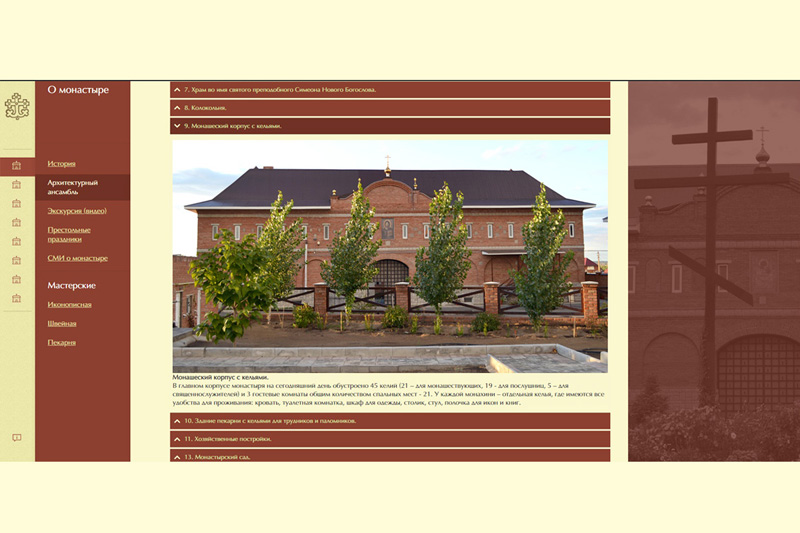 Надеемся, что посетители сайта с интересом посмотрят фотографии архитектурного ансамбля обители, ознакомятся с историей монастыря. А более подробно обо всем происходящем в обители можно узнать в разделе «События», где размещена информация о том, чем жила и живет монашеская община, начиная с 2013 года. Тексты дополнены многочисленными фотографиями, которые разворачиваются во весь экран.