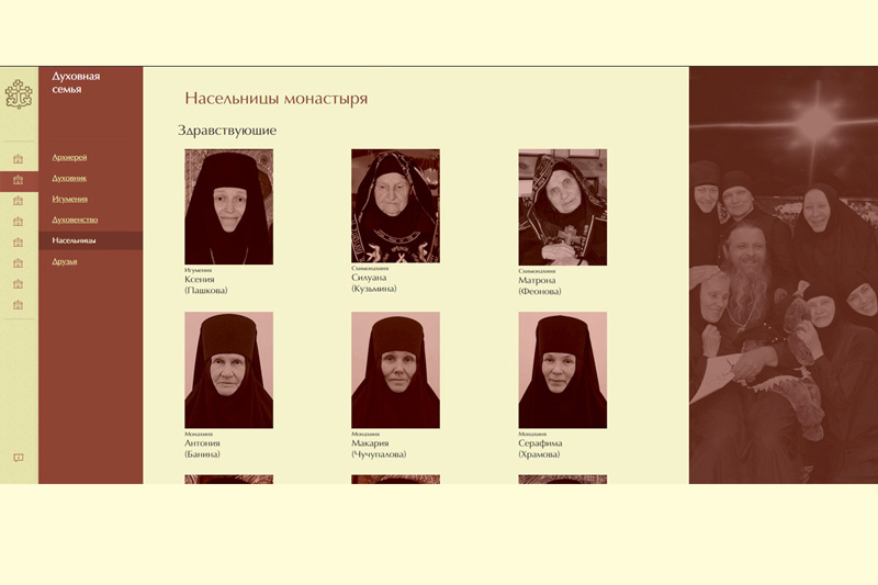 На главной странице вас встретит фотография монашеской семьи и небольшой фильм о жизни орской общины. В нем духовник обители протоиерей Сергий Баранов рассказывает о том, что есть монашество, в чем его смысл. Чтобы познакомиться с биографиями монахинь, послушниц, духовенства, нужно зайти в раздел «Духовная семья».