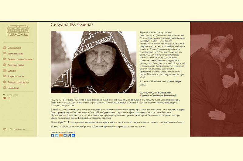 Для удобства пользователей на главной странице работает поисковая система. Здесь же находятся ссылки на страницы Иверского монастыря в социальных сетях «Вконтакте» и «Инстаграм». Блок «Поделиться информацией» поможет посетителям сайта быстро публиковать ссылки на интересные им страницы в соц. сетях и блогах.