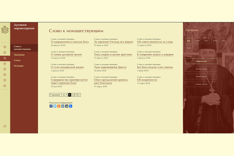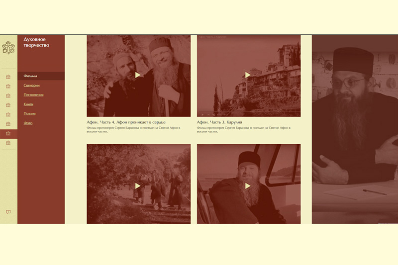 Одна из главных рубрик – «Духовное мировоззрение». Здесь вашему вниманию предложены материалы протоиерея Сергия Баранова: проповеди, слова к монашествующим, статьи, интервью и прочее. Также духовнику монастыря можно задавать вопросы, которые вас волнуют. Ответы будут опубликованы на сайте. Рубрика «Духовное творчество» предлагает видеофильмы, песнопения, книги для просмотра и скачивания.
