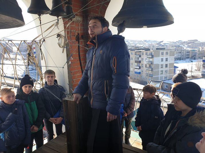 Затем отец Максим и гости понялись на колокольню. Там священник кратко рассказал о видах колокольных звонов и даже предложил попробовать позвонить в колокола. Закончилась встреча чаепитием, за которым члены спортсмены поблагодарили священника за теплый прием и вручили символические подарки от своей команды.