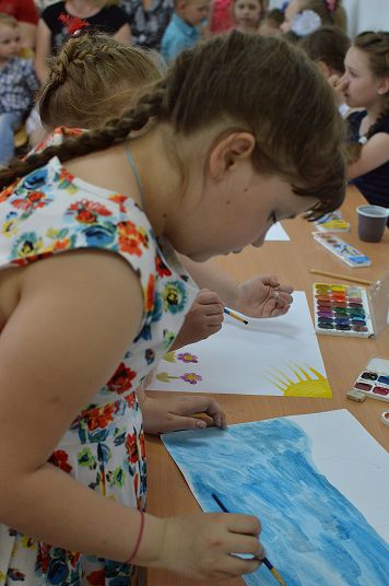 Затем ребята с импровизированной сцены поздравили своих мам, бабушек и педагогов, исполнив в концерте песни, стихотворения и даже сценки про нежность, материнскую любовь, доброту и заботу. Во время творческих номеров на заднем плане Полина Сухарева и Ксения Краснова рисовали посвященные хорошему настроению картины, которые потом были подарены сидевшим в зале дамам.