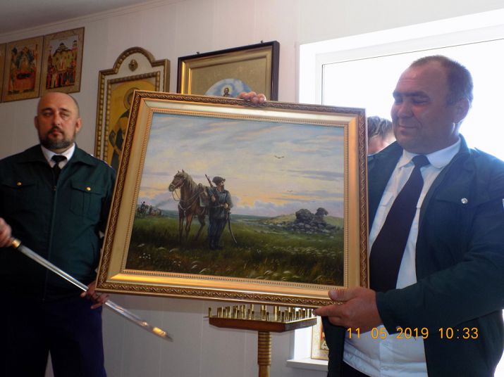 После церемонии присяги гости тепло поздравили новых казаков с памятным в их жизни событием. При этом от казаков п. Светлого и Покровского прихода в дар актюбинцам была передана картина светлинского художника Владимира Фёдорова, а от адамовцев – складень с иконами Спасителя и Богородицы.