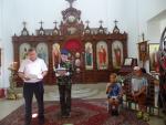 Руководитель воскресной школы Галина Николаевна Кригер поздравила гостей праздника с Пасхой Христовой и днём святых жен-мироносиц. После поздравления Кадеты клуба «Казачок» исполнили песни, которые они привезли в подарок прихожанам храма с. Хабарного.