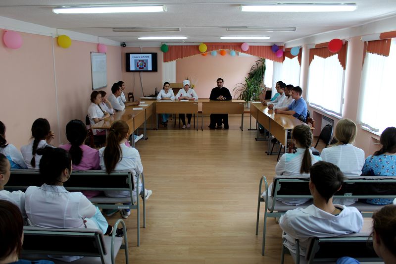 ГАЙ. 24 мая 2019 г. В рамках празднования Дня славянской письменности и культуры прошла беседа священника Виталия Кудрявцева со студентами Гайского филиала Орского медицинского колледжа о духовном значении слов.