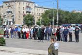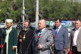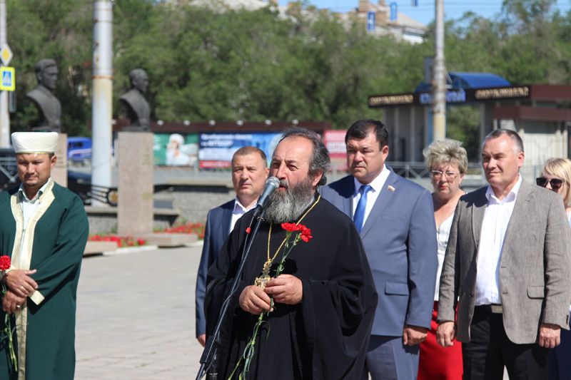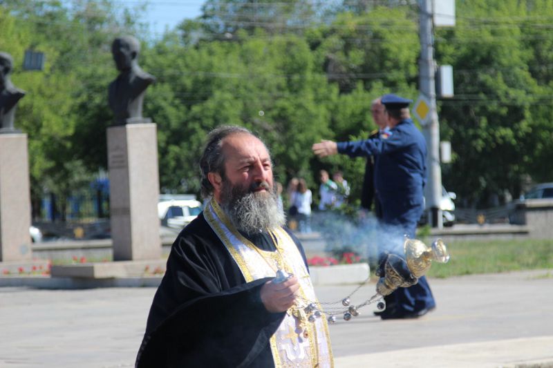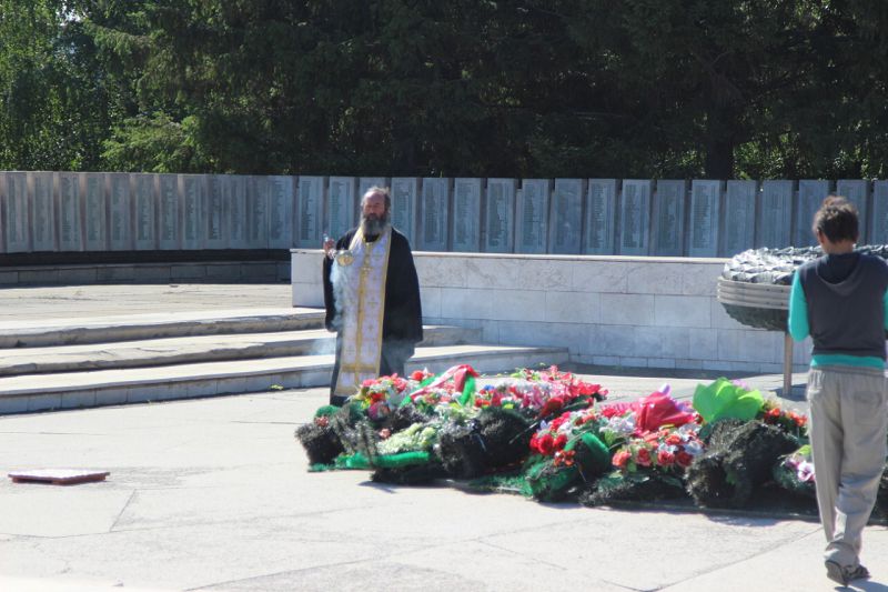 Затем протоиерей Александр Куцов отслужил панихиду по погибшим защитникам Отечества у мемориала «Вечный огонь» на пл. Победы и принял участие в торжественном митинге. В своей речи отец Александр отметил преемственность патриотических традиций, на которых всегда держалась Россия, побеждая многочисленных врагов с давних времён и до наших дней!
